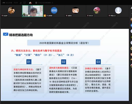 2025年10月15日下午,外国语学院邀请南京邮电大学洪洁教授做客“思·语”学术沙龙,做题为《国家社科基金项目申报经验分享》的学术讲座。讲座在弘文1-108以线上会议的形式展开,由浦立昕院长主持,学院全体专任教师参加了本次活动。
