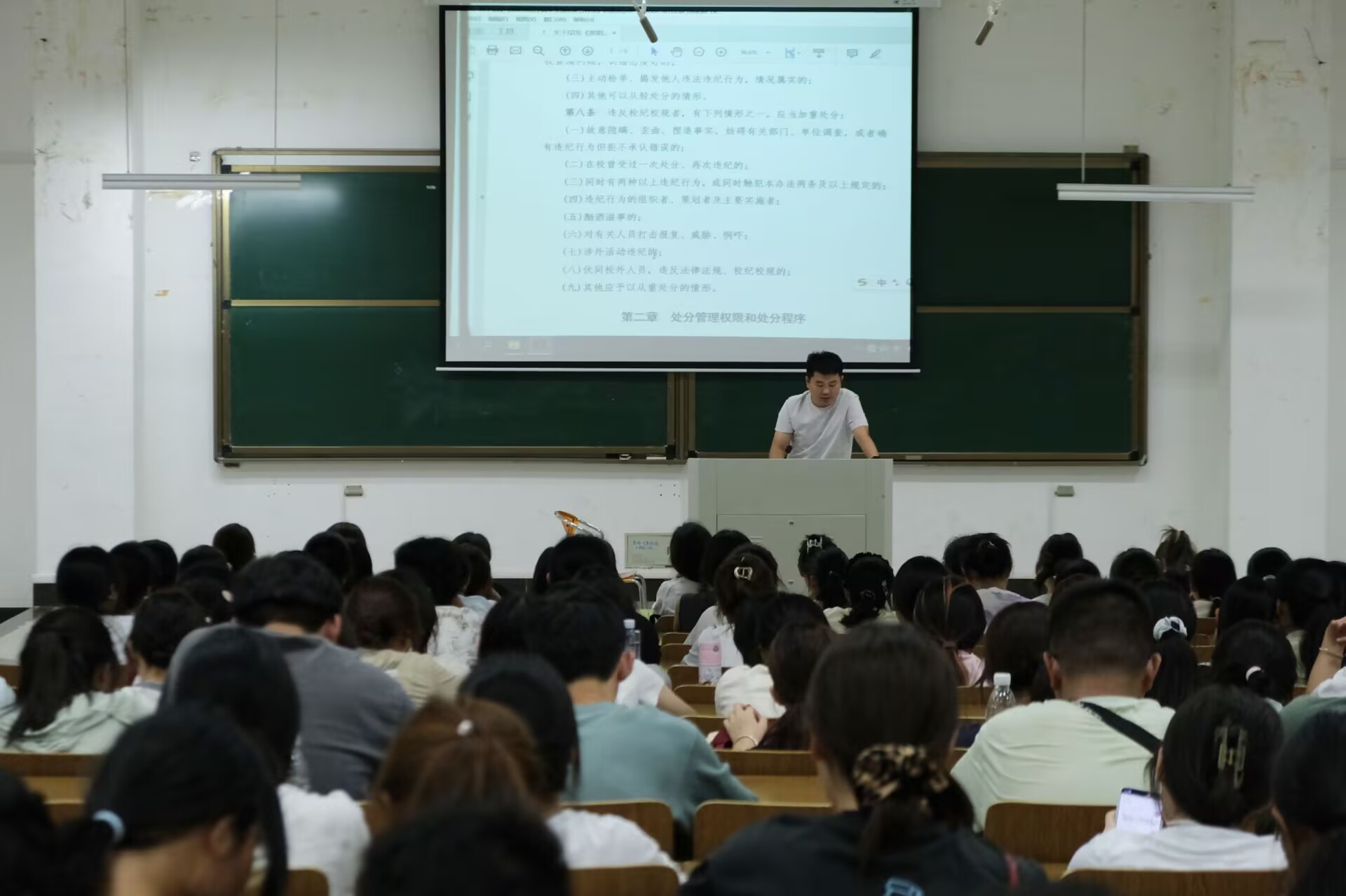 讲座伊始,张海鹏老师首先对学校规章制度进行了详细解读,助力新生了解学校在违纪处分等方面对规定与要求。接着,张老师通过讲解宿舍评分细则、违章电器等内容,让新生更深入地了解我校学生宿舍管理的要求,帮助他们尽快融入校园生活,提前熟悉宿舍管理规范。最后,张紫瑄老师系统介绍我院综合测评和评奖评优的制度与流程,引导 2025 级新生提前规划大学生涯,有针对性地在学习、活动和比赛等方面付出努力、做好规划。