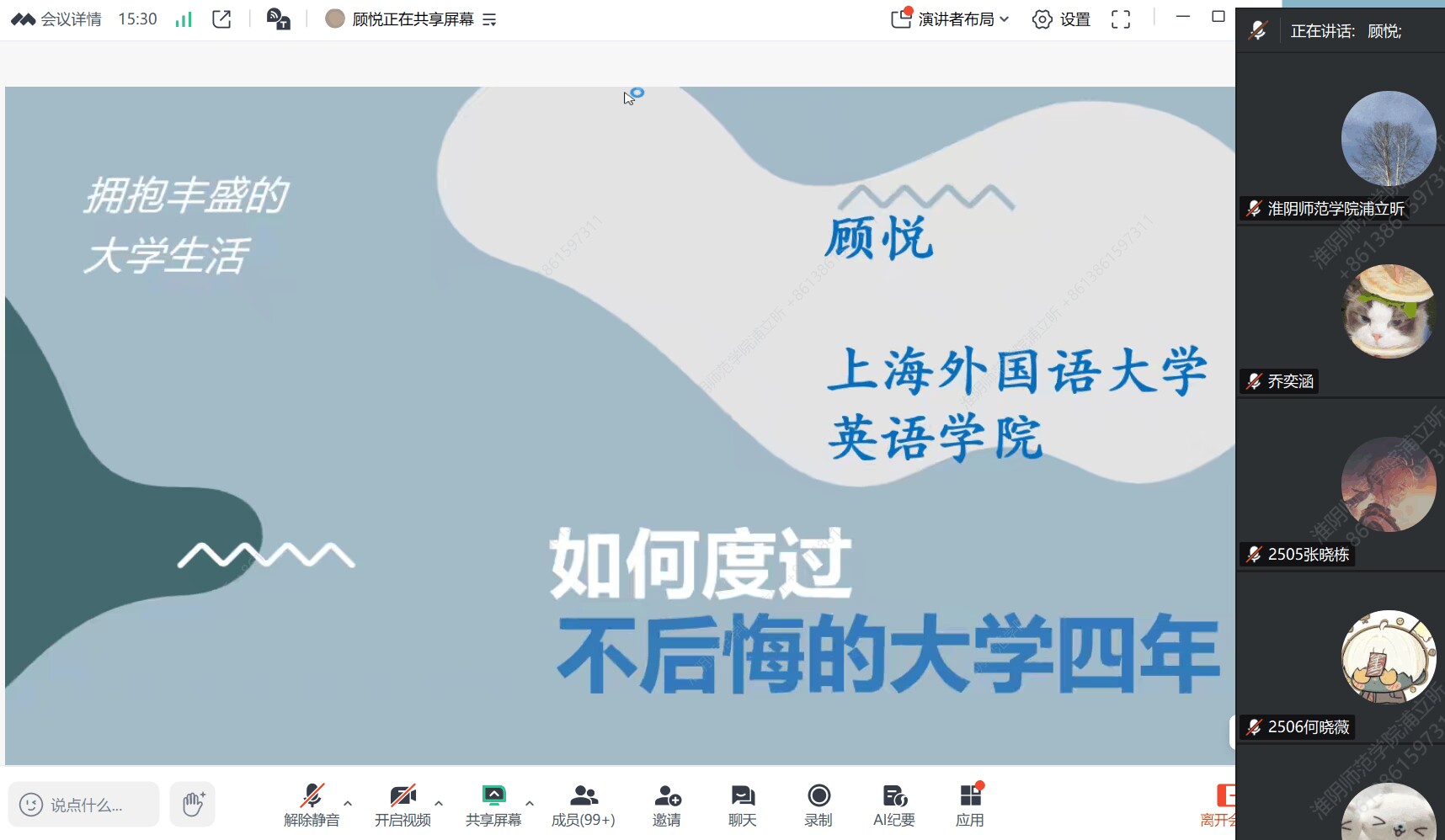 为引导2025级新生规划充实且有意义的大学生活,外国语学院于10月12日开展以“如何度过不后悔的大学四年”为主题的线上专题讲座。此次讲座由上海外国语大学英语学院教授、博士生导师顾悦担任主讲,2025级全体学生参与。